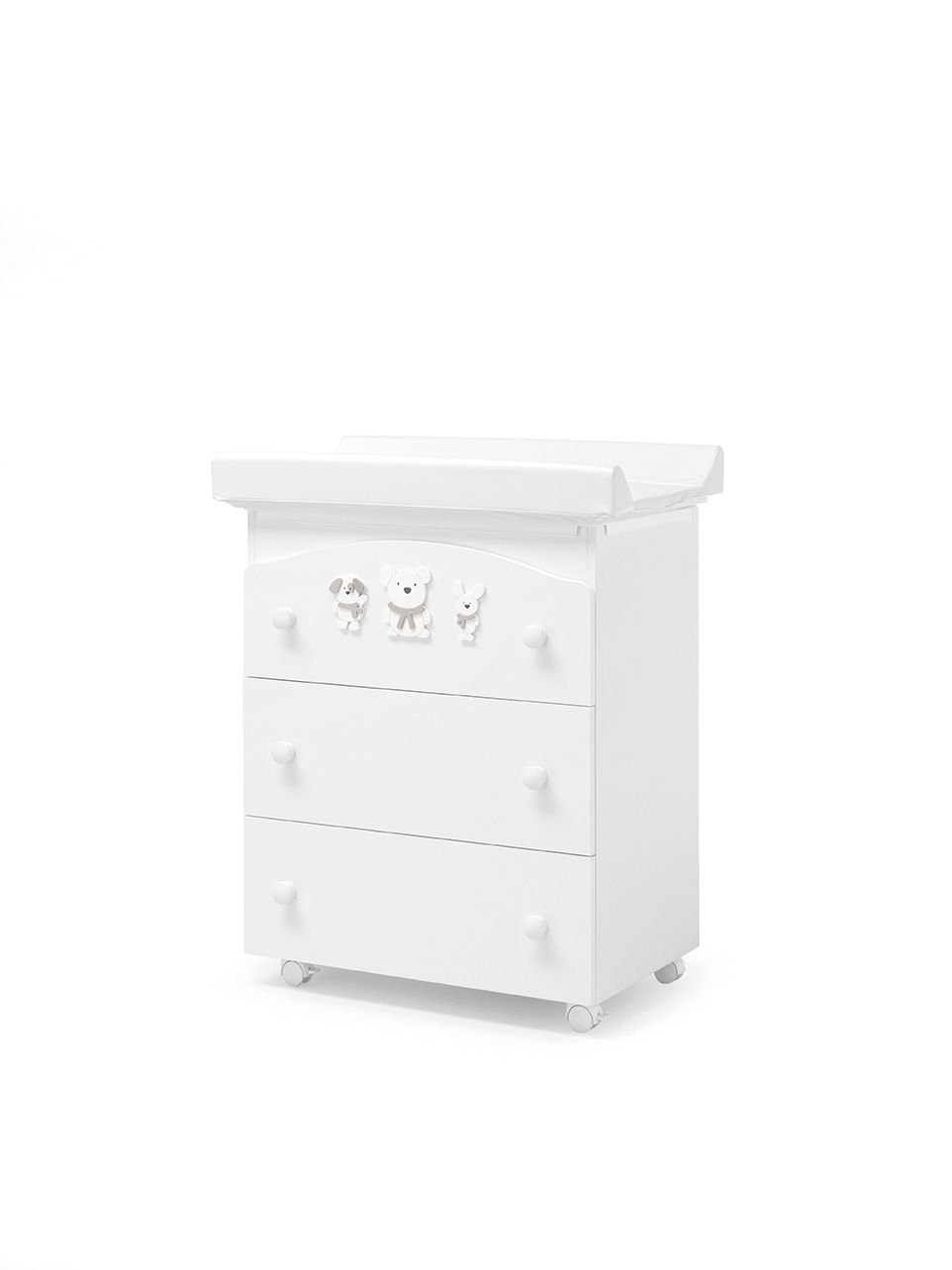 Erbesi Pongo bələk dəyişən komod (Pongos): PVC örtüklü formaldehidsiz panel, anatomik sürüşməyən vanna üçün səth, fiks bağlamaq üçün yer, taxta tutacaqlar və ikisi əyləcli 4 rezin örtüklü fırlanan təkər. Metal relslərdə üç siyirtmə. Dəyişən döşək və vanna daxildir. Avropa standartı ilə sınaqdan keçirilmişdir 12221-1: 2008 + A1: 2013.