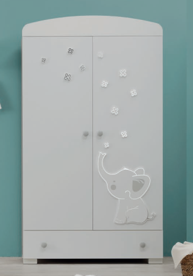 Erbesi Elly iki qapılı dolab (Wardrobe) — İtalyan istehsalı, premium keyfiyyətli uşaq otağı dolabıdır. 100×55×177 cm ölçüləri, 2 qapısı altında asılqan şaquli qarderob bölməsi və alt bölmədə böyük sürüşən siyirmə ilə təchiz olunub. Dolab həm uzun müddətli istifadə üçün praktik, həm də estetik dizayna malikdir.
